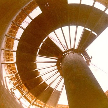 The height of the chimney is 80 metres. TA 5-ton winch is mounted on the sliding type for lifting concrete and iron rei…